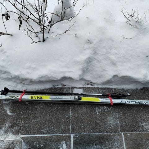 Voideltavat perinteisen hiihtotyylin sukset. Suksien pituus 192 cm ja sauvat 135 cm,