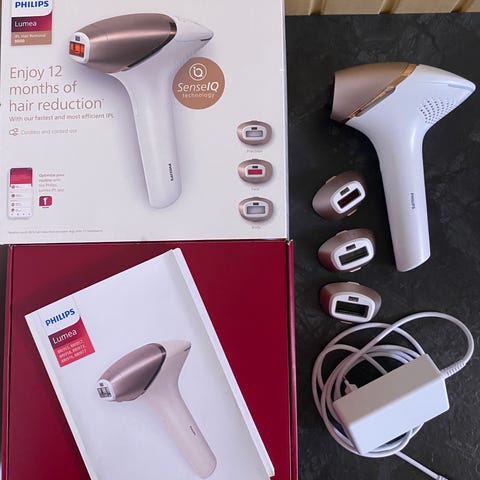 Philips Lumea IPL-valolaite valkoinen väri. Sisältää laitteen, virtalähteen ja kaksi hoitokappaletta. Käytetään ihokarvojen poistoon valopulssiteknologian avulla.