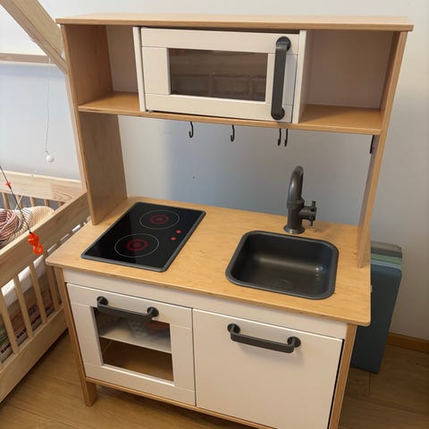 Ikea keittiö seuraavalle leikkijälle. Mukaan kuvassa näkyvät kattilat ym., lautasia sekä pizzasetti.