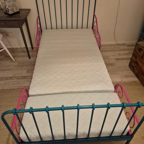 Patja, lipasto ja sängyn koriste lehdet ostettu Ikeasta. Sängynrunko ostettu JYSKistä. Dino tehty itse.