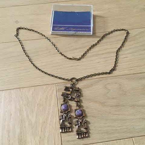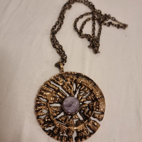 Pentti Sarpaneva kaulakoru, pronssia ja ametisti. Ketjun pituus n. 67cm. Riipuksen korkeus 6cm ja leveys 4,5cm.