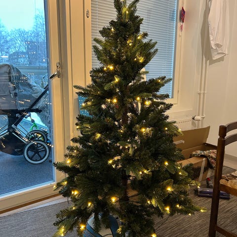 Myydään joulukuusi pois muuton tieltä. 210 cm korkea. Oksat osittain muoviset. Valot oksilla. Koristeet tulee mukaan.