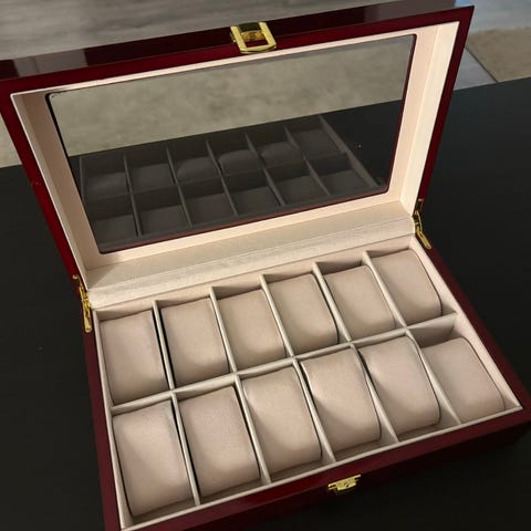 Myydään tyylikäs aidosta puusta tehty kellolaatikko. Tumma punaruskea sävy (burgundin suuntainen), erittäin laadukkaan ja premium-henkinen ulkonäkö. Koko noin 18 × 13,5 × 9 cm. Edessä lukittava nappi, ja laatikkoon mahtuu myös isokokoisempia kelloja.