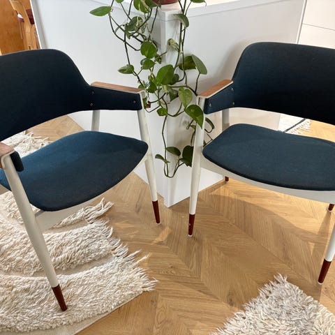 Istuinosa nahkaverhoiltu Gusta Designin toimesta, josta tuolit aikanaan ostettukin. Kahdessa tuolissa nahka saanut kulmasta pientä osumaa (näkyy kuvassa).