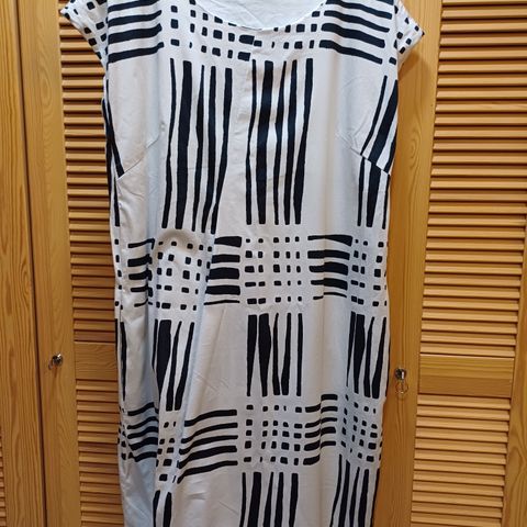 Marimekon Nuotta-mekko. Sivutaskut. Vuoritettu. Kokolappu otettu pois, vastaa mielestäni kokoa 42. Mitat: kai-kai 54 cm, pituus hartia-helma 97 cm. Nouto Hki tai postitus (kulut ostajalle).