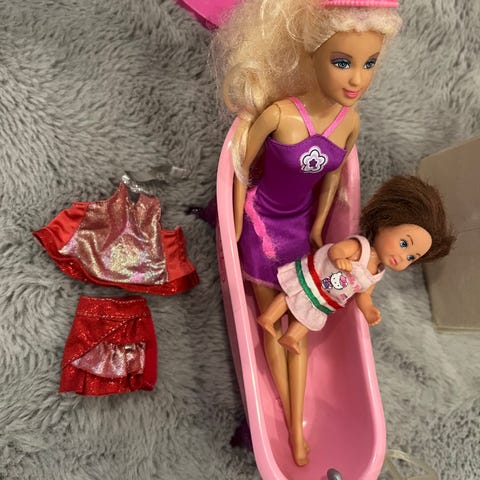 Barbie lasten lelu, sisältää sinisen altaan ja liukumäen sekä kaksi Barbie-nukkea. Nuken mukaan rantakassi ja juomapullo. Nouto tai postitus.