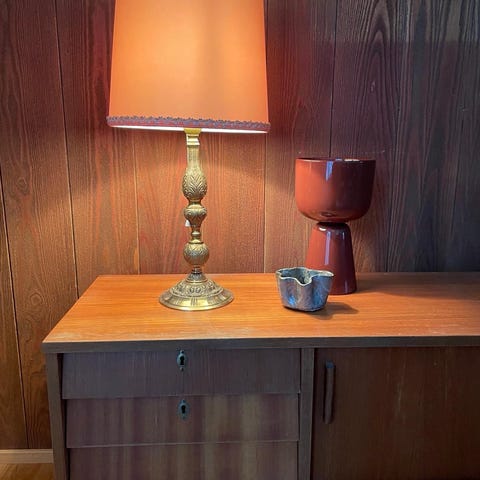 Myydään vintage-tyylinen messinkinen pöytävalaisin kermanvärisellä varjostimella. Korkeus 69 cm.
