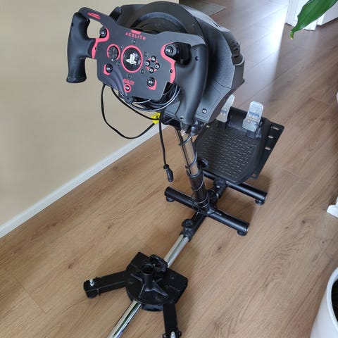 Hyvässä käyttökunnossa oleva ratti-poljinsetti jäi ylimääräiseksi uusien laitteiden alta. Mukaan itse ratin ja polkiminen lisäksi tarvittavat kaapelit sekä käyttöohjekirja. Mukaan löytyy myös pöytäkiinnike, jos ei mahdollisuutta kiinnittää pulteilla telineeseen.