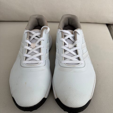 Hyväkuntoiset ja vähän käytetyt Adidaksen golf-kengät. Kauneusvirhe näkyy kuvassa.