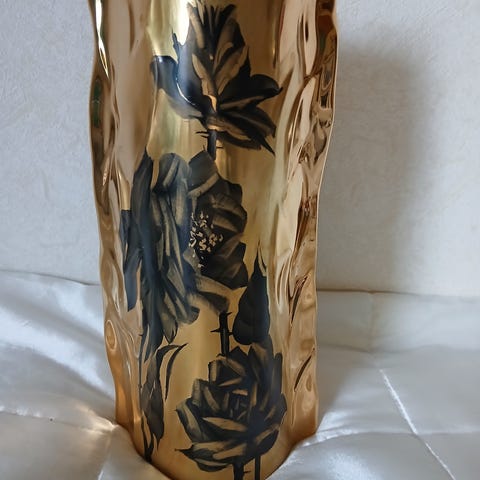Käsinmaalattu ruusukuvioinen maljakko kultaisella yksityiskohdalla. Signeeraus: Tuula Rinne, Hämeenkyrö. Korkeus noin 24cm.