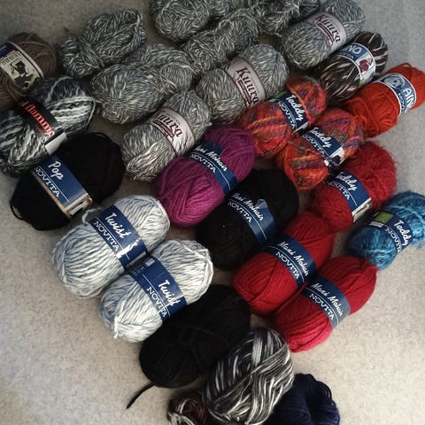Seitsemän veljestä lanka erä, n. 7 kerää a 150 grammaa, yhteispaino n. 1090 g, (muutama on hitusen vajaa + kahdeksas n. 1/2 kerää). Kaikissa ei ole vyötettä, mutta ovat samasta satsista. Väri tuollainen syvä havumetsän vihreä, mielestäni vaikea yhdistettävä muihin, mutta yksistään näistä saa jo M- kokoiselle miehelle villapaidan tai naisten L - kokoisen. Langan koostumus 75% villa / 25% polyamidi. Hyväkuntoiset.