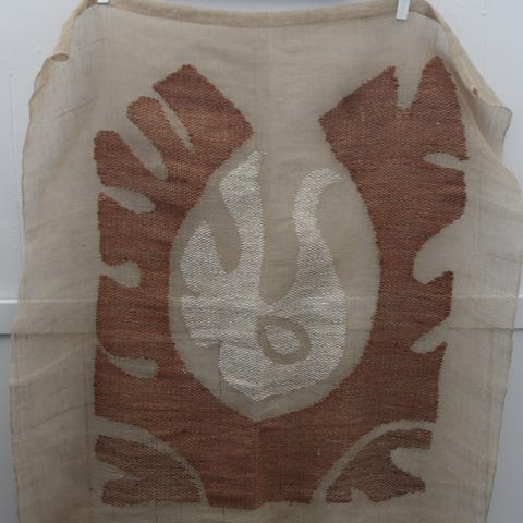 Käsinkudottu pellavainen kuultokudos, jossa on linnun ja lehtien kuviointi luonnon pellavan värisellä pohjalla. Maton materiaali on pellava, ja se soveltuu esimerkiksi sisustuselementiksi seinälle, ikkunaan tai ovi-ikkunaan. Korkeus 101 cm ja leveys 73 cm. Molemmissa päissä tankokujat. Kunto hyvä, taitava n kutojan huolella kutoma.Hinta 19 euroa. Voin lähettää. Mmm.