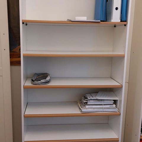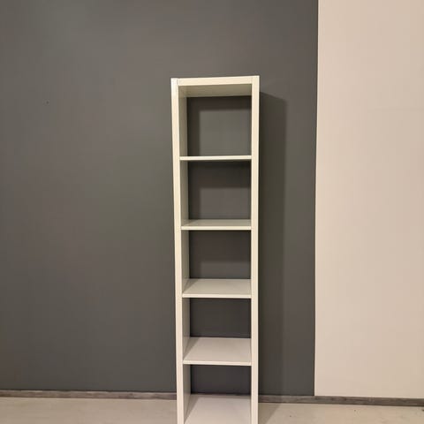 Siniharmaa seinähylly, jossa viisi hyllyä. Alin hylly syvin ja ylin vähiten syvä. Hyllykön mitat: