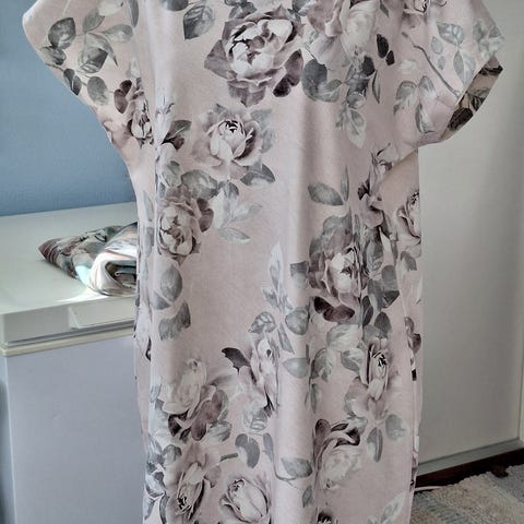 Myydään käyttämätön, viidakkoaiheinen, holkkihihainen trikoomekko/tunika. Pohjaväri vaaleanpunainen, jossa vihreitä lehtikuvioita.