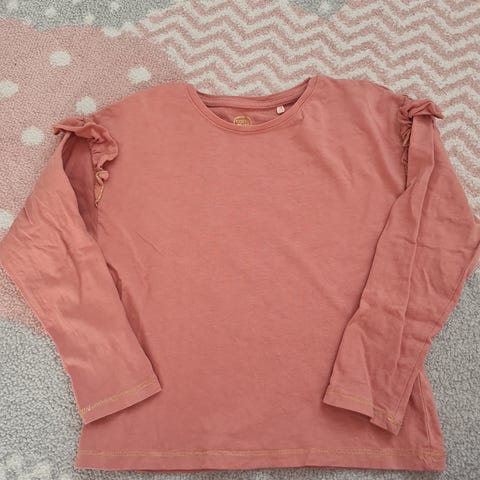 Vaaleanpunainen pitkähiainen paita oravakuviolla. Edessä pientä tahraa/tummentumaa. Koko 110. Mahdolliset postikulut lisätään hintaan.
