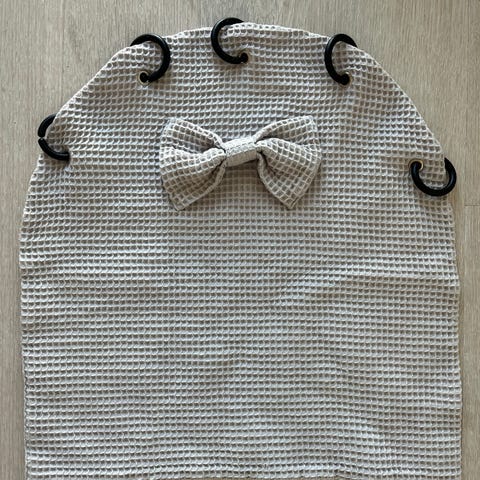 Käyttämätön II-laatuinen pupu-vaunuverho, vohvelikangasta. Takapuolen rengasreiästä lähikuva.