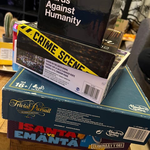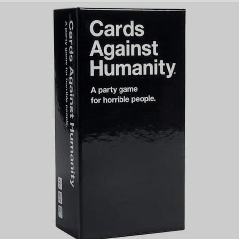 Cards Against Humanity lautapeli, sisältää kortit ja ohjeet pelin pelaamiseen. Peli on tarkoitettu aikuisille ja sopii ryhmäpelaamiseen.