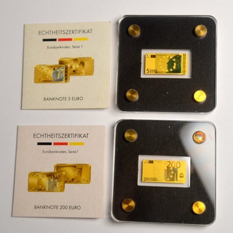 Viiden kultauksella päällystetyn kuparin-nikkelin ECU-mitalin erä 'Kaunein väri ECU' -sarjasta.