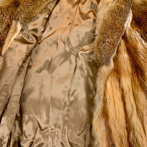Hyväkuntoinen musta/mustanruskea kettuturkki, joka on periaatteessa käännettävä, mutta koukut tietysti joutuvat silloin ”väärälle” puolelle. Taskut voi siis kääntää kummallekin puolelle. Irrotettavat olkatoppaukset. Kainalomitta on noin 67 cm ja pituus 127 cm.