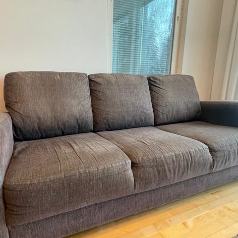 Myydään pois käyttämättömäksi jäänyt sohva. Harmaa kolmen istuttava, hieman sohvan alareunoissa raapimisjälkiä. Vain nouto.