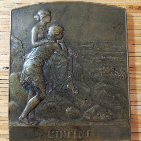 Tämä 1800-luvun ranskalaisen koulukunnan pronssilautanen on suuri ja painava koriste-esine, joka heijastaa eleganssilla modernistista estetiikkaa. Reliefissä näkyy alastomana makoileva naisvartalo, joka on osana teksturoitua taustaa, joka muistuttaa veden liikettä, viitaten selvästi Art Nouveau -tyylin orgaanisiin motiiveihin.