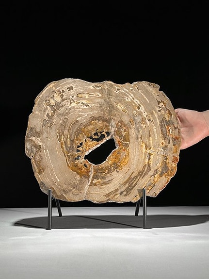 Se on valmistettu massiivisesta pronssista, jossa on kultainen patina, mikä korostaa volyymeja ja lisää visuaalista lämpöä. aaltoilevat ja koristeelliset reunat vahvistavat orgaanista ja koristeellista estetiikkaa. Vaikka sitä on suunniteltu tarjoilualustaksi, sen taiteellinen arvo viittaa enemmän symboliseen tai näyttelykäyttöön, kuten keräilyesineenä.