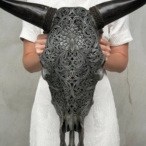 Suuri käsin kaiverrettu härän pää, jonka ovat kaivertaneet taiteilijat, jotka ovat siirtäneet muinaisen kaiverrustaidon isältä pojalle.