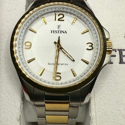 Elegantti ja hienostunut Festina Swiss Made -automaattikello, jossa on kiehtova avosydänmuotoilu, joka paljastaa koneiston kellotaulun läpi. Kellossa on samppanjakullanvärinen teksturoitu kellotaulu, minimalistiset tuntimerkinnät ja hohtavat osoittimet. Kaikki tämä on koteloitu kullattuun ruostumattomasta teräksestä valmistettuun koteloon, jossa on safiirilasi, joka takaa poikkeuksellisen naarmuuntumisenkestävyyden.