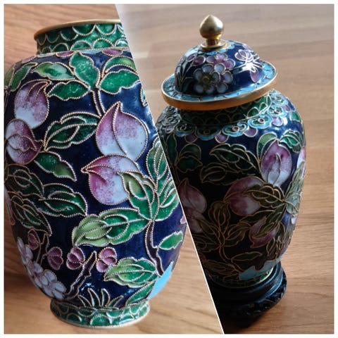 Cloisonne- emaloitu kaviaari-/suola-/maustekulho. Korkeus n 3 cm, leveys n 5,5 cm