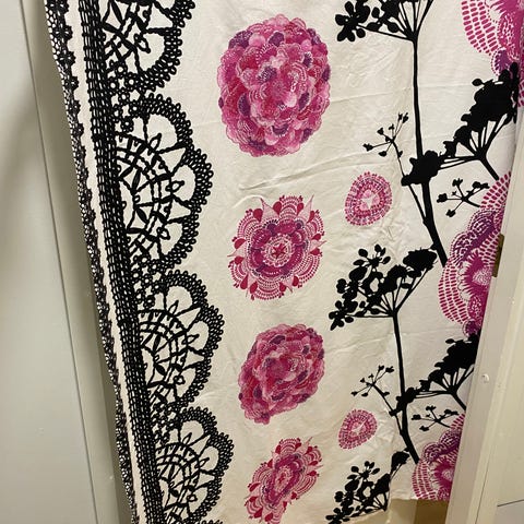 Ohut valkoinen kangas jossa riikinkukko. Tankokuja