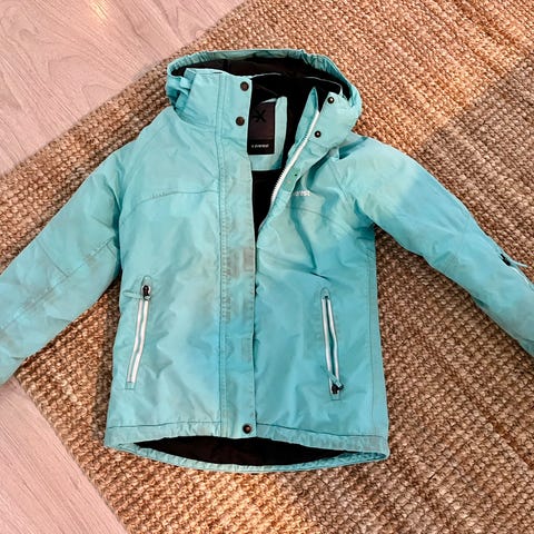 Keltainen Everest-merkkinen talvihaalari, koko 134. Haalarissa on monin paikoin heijastinnauhaa, huppu on irrotettavissa, hihansuut kavennettavissa tarranauhalla ja lahkeet puolestaan nepeillä. Huomaathan kuvista, että lahkeiden takana olevaa kulumaa on paikattu silitettävällä perhospaikalla. Kenkälenksut ovat aika lailla täysin palvelleet.