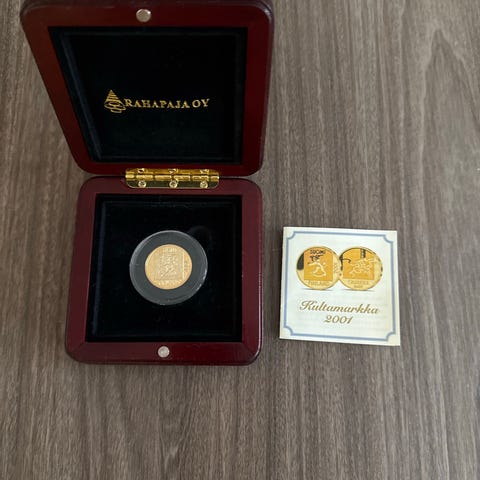 Suomi 1 markka kultaraha. Kultainen kolikko, jossa on 1 markan arvo ja Suomen vaakuna. Keräilyesine. Tarjoa,