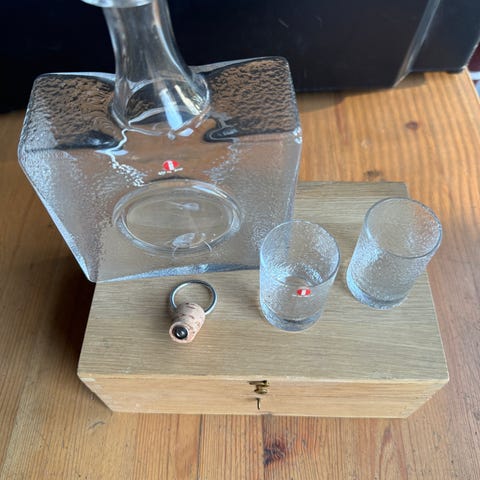 Karahvi ja kuusi kpl Mini sarjan snapsilaseja.