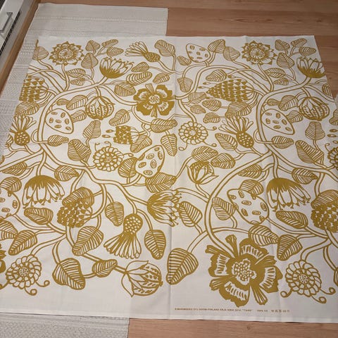 Myydään puuvillainen Marimekko-kangas, jossa 17kpl huiviaihioita. Yhden huiviaihion koko on n. 57x54cm. Puupainatus ja reunat ovat mustat, tausta violettia/vaaleanpunaista/vaaleansinistä.