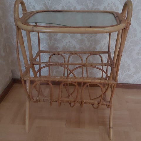 Vanha puolipyöreä rottinkipöytä. Pientä ajanpatinaa, mutta ikäisekseen hyväkuntoinen. Vain nouto Joensuun keskustasta.