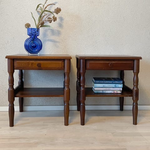 Kauniit sirot tammiset yöpöydät, pinta hiottu ja vahattu kestämään kaatuvat vesilasit. Hyvässä kunnossa ei hajuja. Kaunis pariskunta.