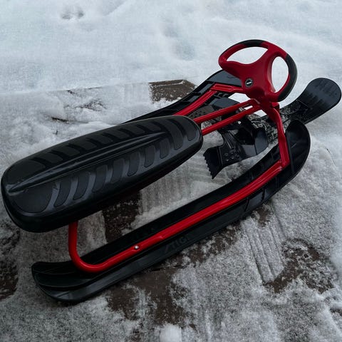 Hyväkuntoinen rattikelkka. Vetonaru ei kelaudu, muutoin täysin toimiva kelkka.