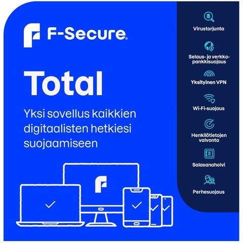 F-Secure TOTAL on PC- ja Mac-tietokoneille sekä Android- ja iOS-älypuhelimille ja tableteille kehitetty tietoturva, joka suojaa Internetin käyttösi ja estää sen seuraamisen.
