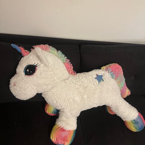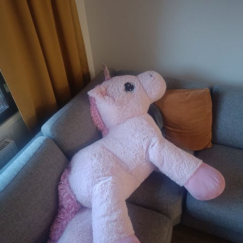 Myydään valkoinen yksisarvispehmolelu. Todella siisti. Savuton koti. Ei lemmikkejä. Korkeus pään kohdalla noin 40cm.