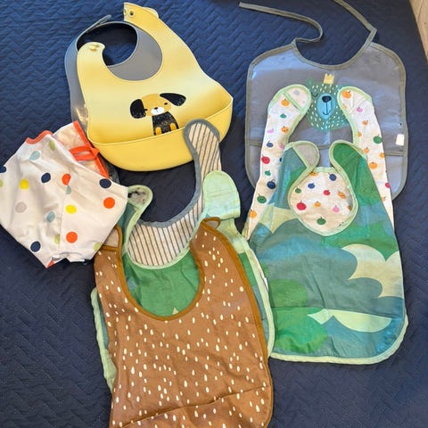 Myydään paljon käytettyjä, mutta käyttökelpoisia ruokalappuja (11 kpl). Pieniä tahroja löytyy.