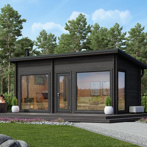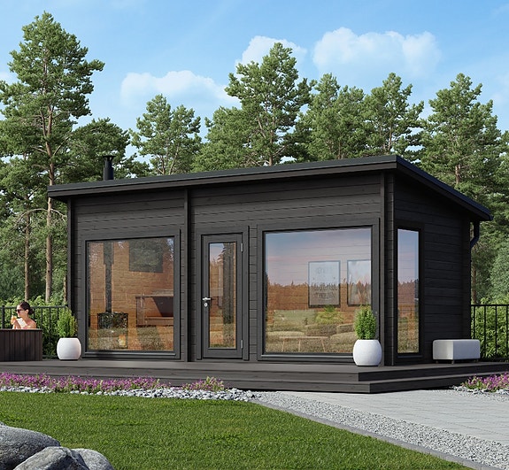 Saaga 13 pulpettikattoinen 13 m² moderni pihasauna. Pihasaunassa on tilava 5,5 m² sauna ja 6,6 m² saunatupa/pukuhuone. Saunapaketin toimitussisältö on laaja ja siihen kuuluu mm. lauteet.