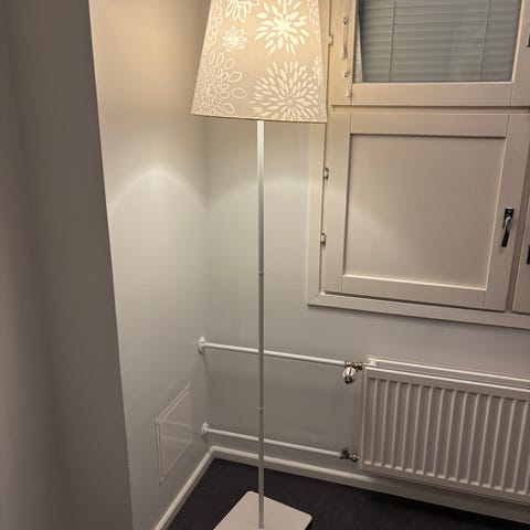Hopean värinen jalkalamppu, halogenlamppu palanut tällä hetkellä, musta johto säilytyksen vuoksi kiedottu jalkaan.