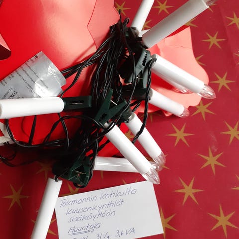 Sekalainen joulusetti joulukuusen jalka punainen viltti jotain koriste valoja/valotikkuja verhot koristeita