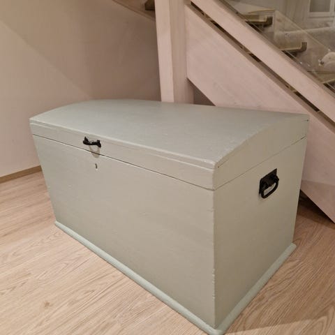 Amerikkalainen uusvanha komea arkku myytävänä. Kansi toimii hyvin. Lukon salpa poistettu, koska ei ole avainta. Kuvan mukaista jälkeä kannessa ja toisessa päässä pari kolhua alaosassa. Sisusta erittäin siisti eikä ole hajuja.