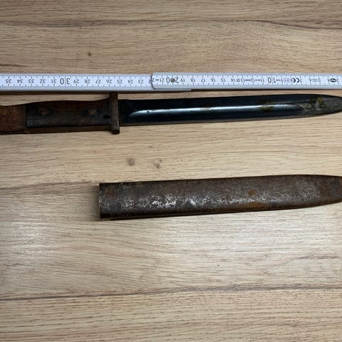 Saksalainen sotilaspistin. Terässä lukee toisella puolella FDICK ja toisella puolella MADE IN GERMANY. Käytetty esine, mahdollisesti koriste- tai keräilykäyttöön soveltuva.