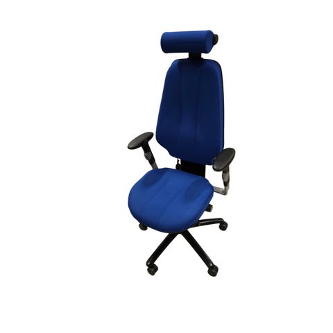 Martelan ikoninen työtuolimalli sinisellä verhoilulla. Monipuoliset säädöt, mm. ristiselän ilmatyyny.