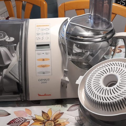 Moulinex Masterchef 500 Classic monitoimikone, jossa on teriä erilaisiin ruoanvalmistustehtäviin. Sisältää käyttöohjeen ja alkuperäisen pakkauksen.