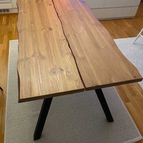 Koti Siilistä vuonna 2020 ostettu iso ja tukeva lankkupöytä mustilla metallijaloilla. Hyvässä kunnossa! Nouto mahdollista aikaisintaan viikonlopun aikana.
