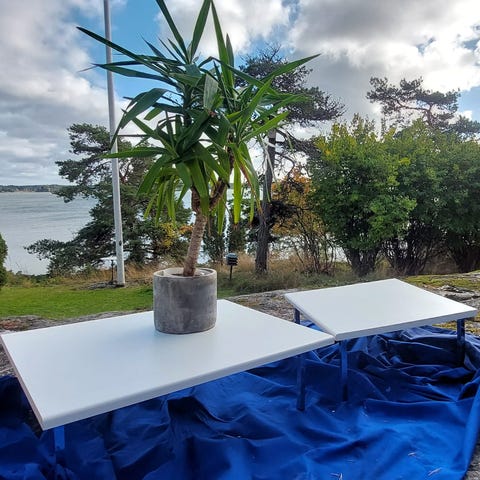 Taso L115cm, K60cm, S45cm ja kaksi pienempää tasoa, jotka toimivat myös penkkeinä/kestävät hyvin istumisen jos lisäpenkkejä tarvitaan.