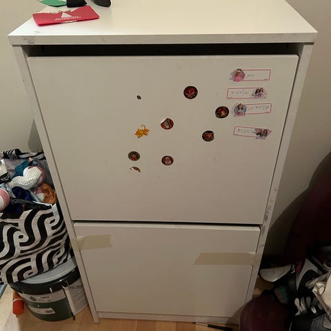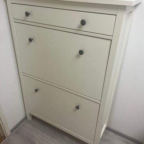 Myydään yleisilmeeltään siisti Ikean Hemnes-kenkäkaappi. Kuvissa näkyy tason ja sivun kulumat. Vaihdettu messingin väriset kahvat.